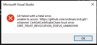 When cloning Ord with Visual Studio code, this error could pop up. The simple fix is to update your Windows: